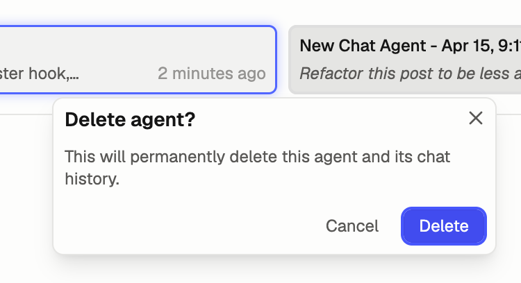 We also fixed a sharp edge in the product: deleting an agent used to happen immediately. That was too easy to trigger by mistake, especially when the cost is losing the conversation with it.
