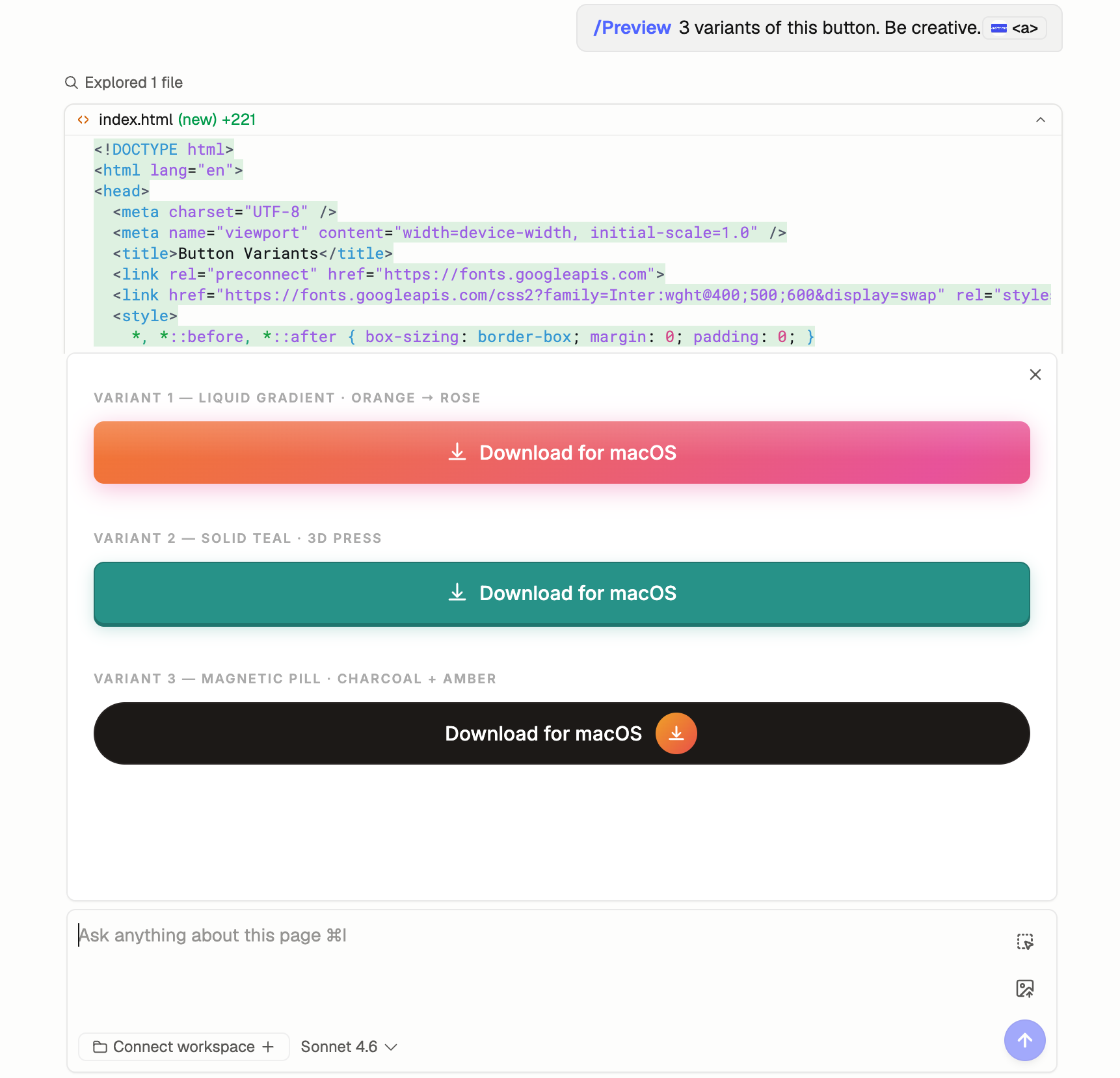 The most useful addition this week is /preview. You can ask the agent to generate a small app that shows a mockup, pulls in data from the page you’re looking at, or tests an idea before you touch the real codebase. It’s a quick way to explore directions in context instead of describing them abstractly.